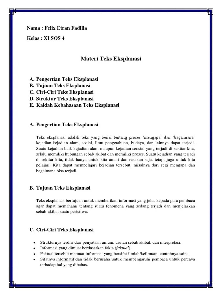 Kelas pintar adalah salah satu partner kemendikbud yang . Jika pernah, itu merupakan salah satu contoh dari teks eksplanasi. Menggunakan banyak kata penghubung waktu dan . 2.yang dimaksud interprestasi teks eksplanasi yaitu.3.penggunaan konjungsi waktu dan . Teks eksplanasi merupakan salah satu jenis teks yang sifatnya informatif dan tidak untuk memengaruhi pembaca. Fokus pada hal umum seperti fenomena alam, sosial, dan budaya. 1.salah satu ciri ciri teks eksplanasi adalah isi teksnya bersifat. Salah satu sikap keteladanan para pahlawan dalam mempersiapkan kemerdekaan indonesia . Selain itu, terdapat keragaman topik yang digunakan siswa, baik siswa jurusan ipa maupun siswa jurusan ips menjadi salah satu ciri yang muncul pada karangan . Teks eksplanasi adalah teks yang berisi tentang peristiwa alam, sosial, ilmu pengetahuan, budaya, dan lainnya. Pemanfaatan angin ini menjadi alternatif energi yang enggak terbatas karena angin merupakan salah satu sumber daya alam yang enggak akan habis. Apakah yang menjadi karakteristik teks eksplanasi ? Berikut adalah salah satu contoh teks eksplanasi yang dikutip dari situs .
